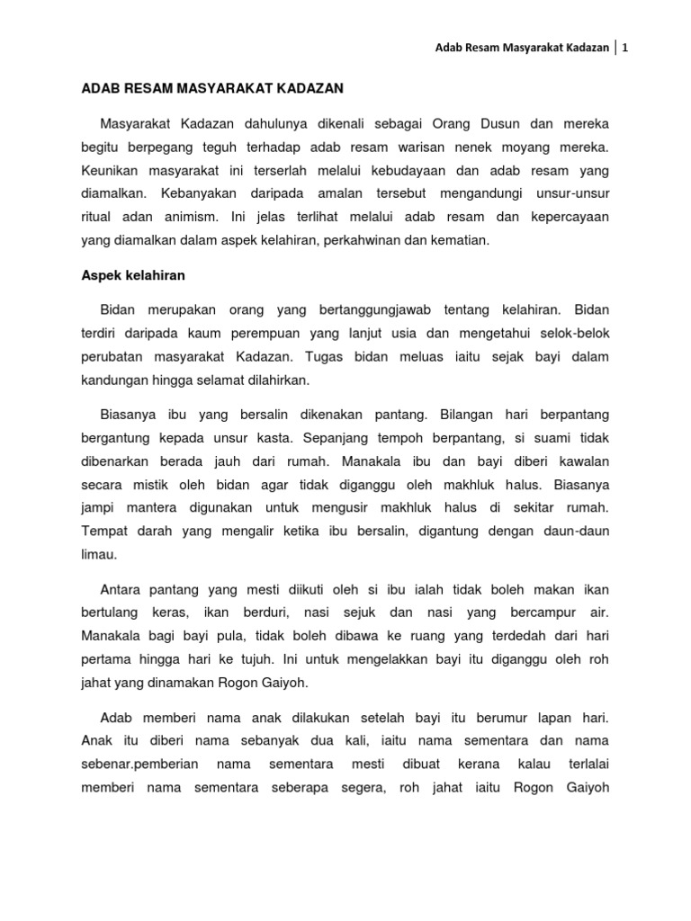 E-buku ini memfokuskan adat resam tiga kaum terbesar di Malaysia iaitu Melayu Cina dan India yang bertujuan memberi pengetahuan dan pemahaman yang lebih jelas amalan setiap kaum tersebut serta penghayatannya. UPACARA DAN ADAT RESAM KAUM KADAZAN DUSUN PAKAIAN Suku Kadazandusun ini adalah rangkuman dua suka utama iaitu Kadazan dan Dusun di mana ia masih mempunyai banyak cabang. ADAT DAN PANTANG LARANG SETIAP KAUM DI MALAYSIA Wednesday 11 January 2017.